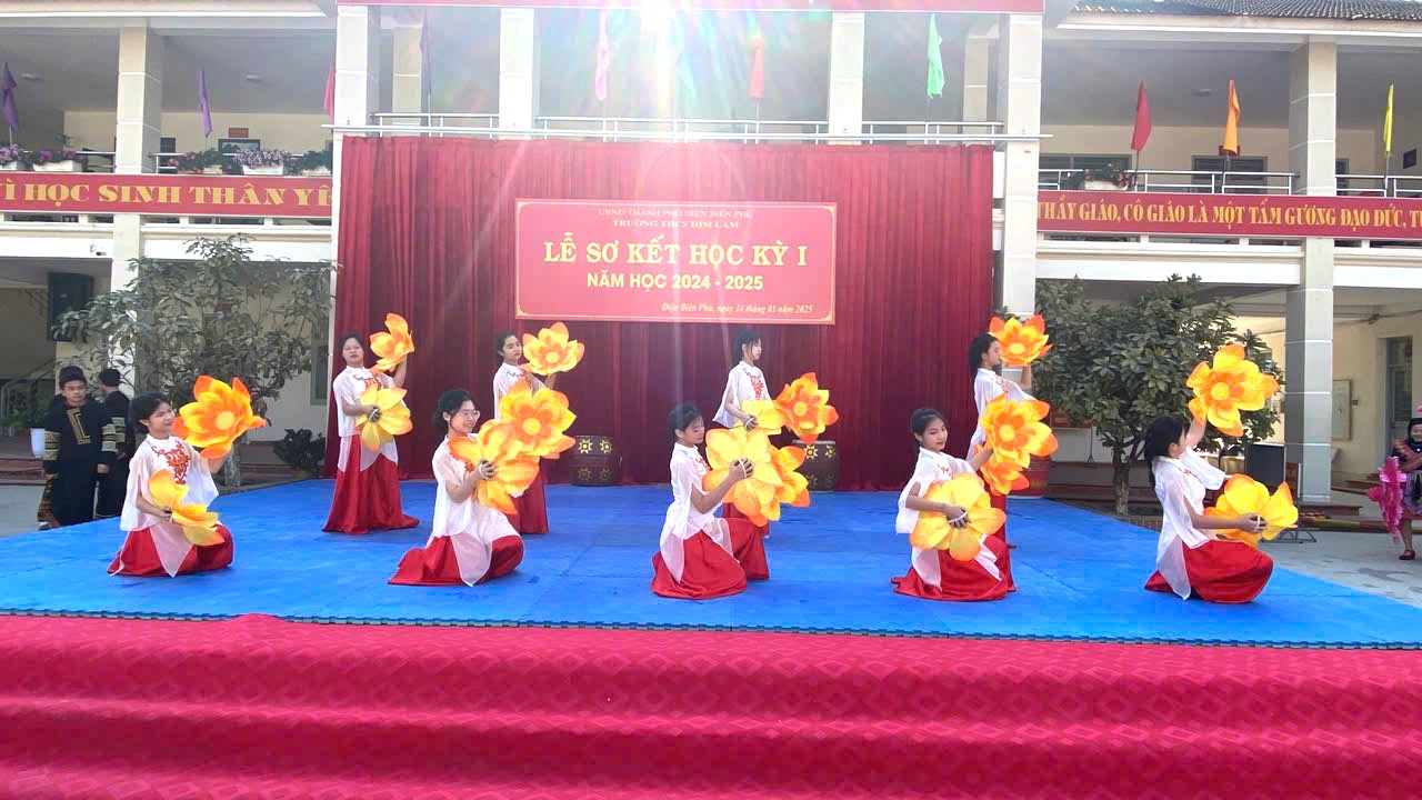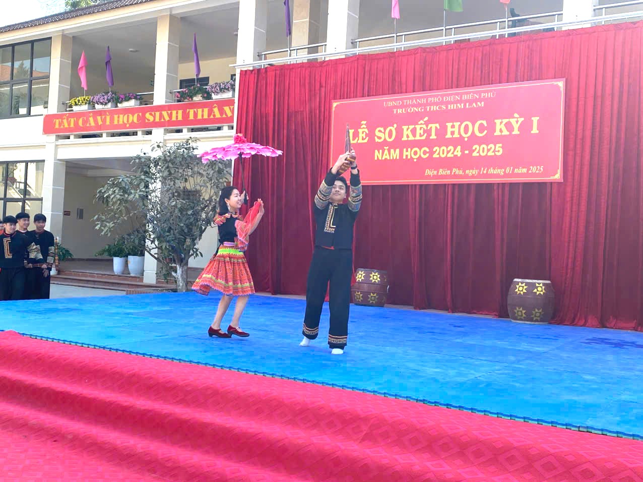 Để chúc mừng cho những thành tích ấn tượng mà nhà trường đã đạt được trong học kì 1, thầy cô giáo và các em học sinh cùng hòa chung không khí lễ hội mùa xuân với màn trống hội, múa khèn, liên khúc dân vũ: Múa xòe và vũ điệu đoàn kết của cô trò trường THCS Him Lam.