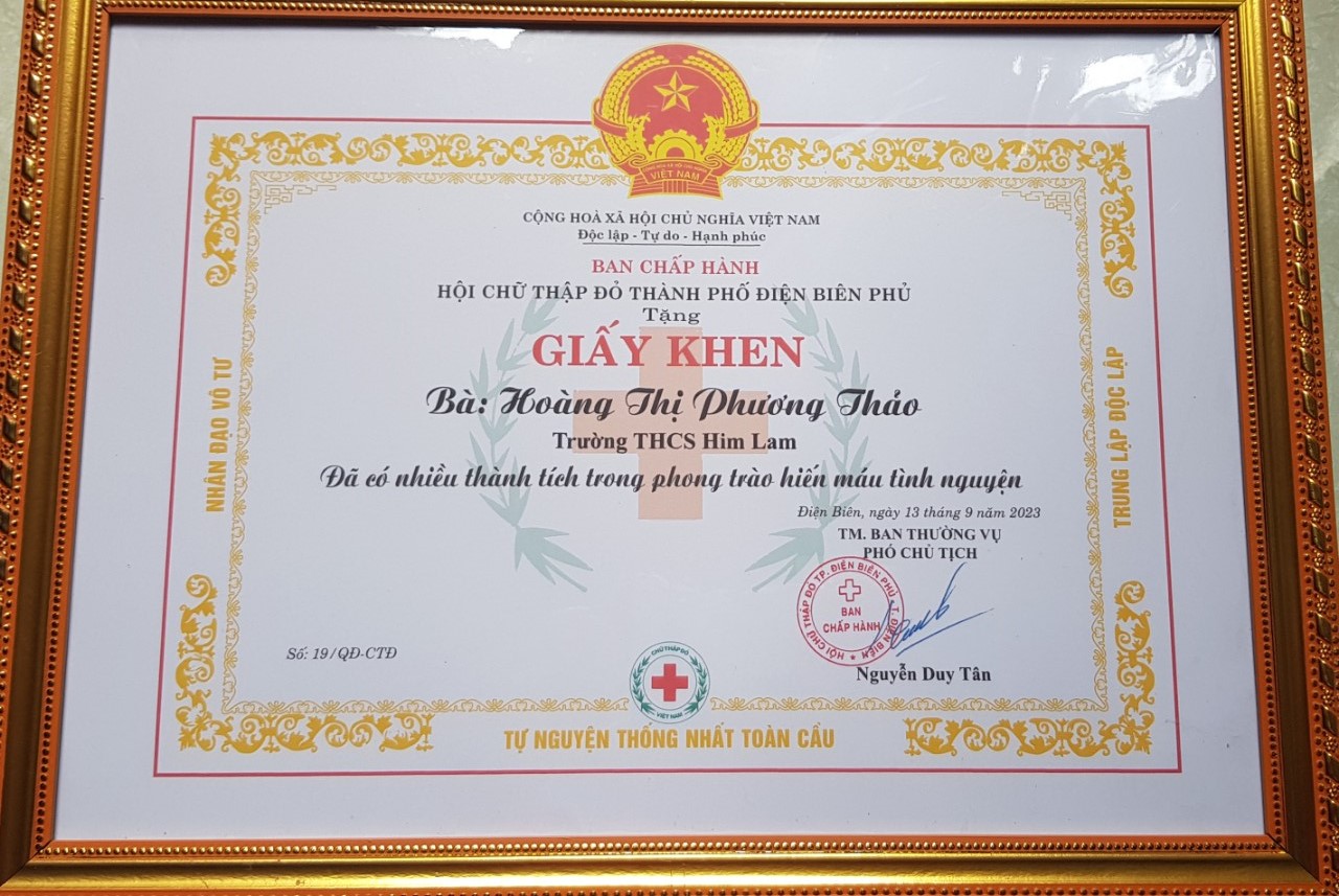 Đây cũng là năm đầu tiên UBND Thành phố Điện Biên Phủ tổ chức tôn vinh người hiến máu tiêu biểu, trường THCS Him Lam vinh dự được Hội chữ thập đỏ Thành phố Điện Biên Phủ tặng giấy khen đơn vị có nhiều thành tích trong phong trào hiến máu; về cá nhân có đồng chí Hoàng Thị Phương Thảo 9 lần hiến máu tình nguyện cũng được nhận giấy khen.