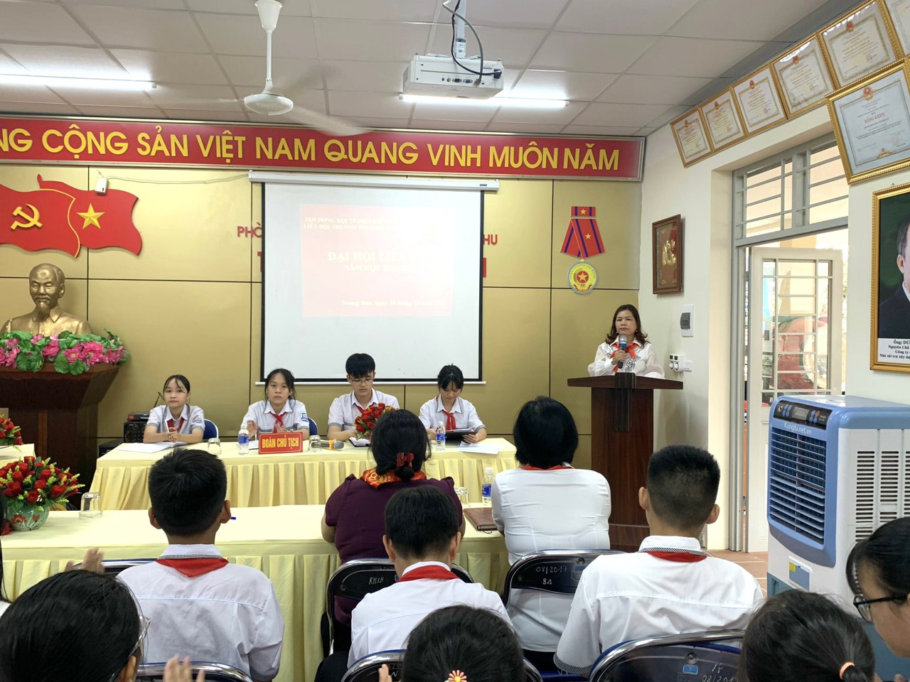 Về dự Đại hội cô Cao Thị Đại đã biểu dương những thành tích mà Liên đội đã đạt được trong năm học 2022 – 2023. Cô nhấn mạnh các bạn Đội viên cần làm tốt hơn nữa phong trào thanh thiêu niên Nhi đồng năm học 2023 – 2024 để xứng đáng là Liên đội vững mạnh, tiêu biểu khối THCS.